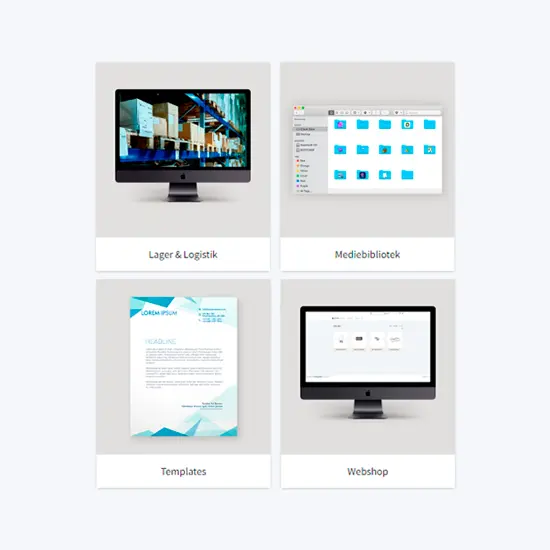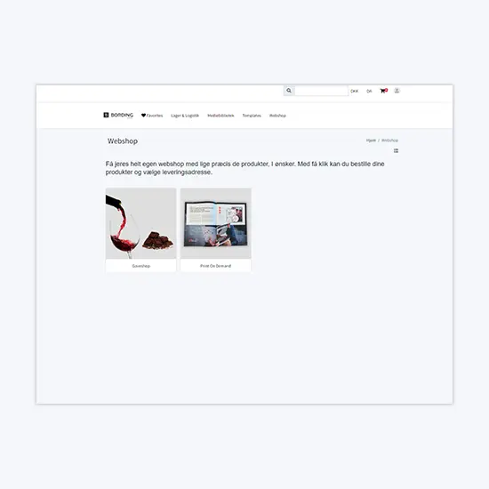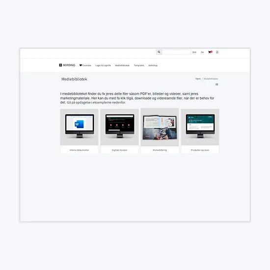 Jeres portal kan indeholde både shopmodul, hvor produkter kan bestilles af jeres afdelinger med få klik. Templatemodul, hvor godkendte skabeloner let kan redigeres inden for de rammer, I fastsætter. Og mediebibliotek, hvor I sikkert kan opbevare fx dokumenter, billeder, videoer og trykfiler, der hurtigt og let kan hentes af jeres afdelinger. Det hele samlet på én og samme platform, der kan struktureres fuldstændig som I ønsker.